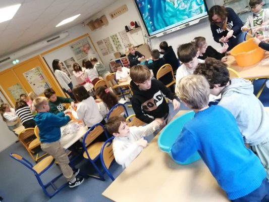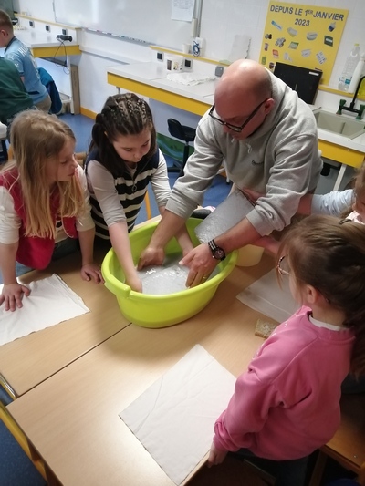 Au cours d’une matinée, les élèves de CE2 se sont rendus à la Maison du Littoral pour participer à l’atelier « Fabriquer du papier recyclé ». Après les explications de Gaëtan, les élèves ont procédé aux différentes étapes : découper du papier, le mouiller, le broyer et réaliser sa propre feuille grâce à un tamis.